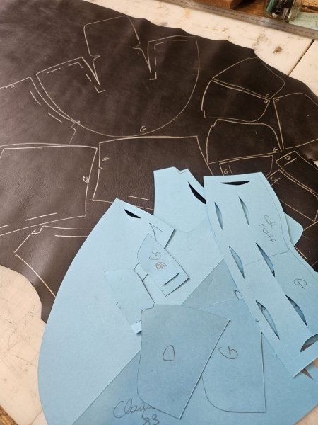 Le patronage achevé, place à la découpe ! Nous disposons les patrons sur la pièce de cuir, puis la découpe s’effectue en suivant la forme des patrons, avec des outils adaptés aux peausseries. Les coupes sont réalisées dans les parties les plus belles de la peau. Chez Maude in France, la pièce de cuir est coupée à la main : nous n’utilisons pas de table de découpe automatique, car nous répondons à une demande personnalisée.